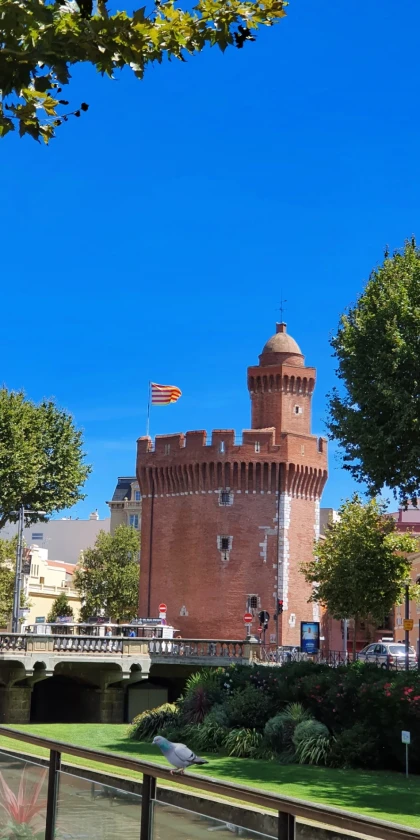 On longe le quai Vauban, cette belle rue piétonne offre une promenade sur le bord du canal de la basse et nous avons une superbe vue sur le Castillet, « l’emblème de notre ville ».